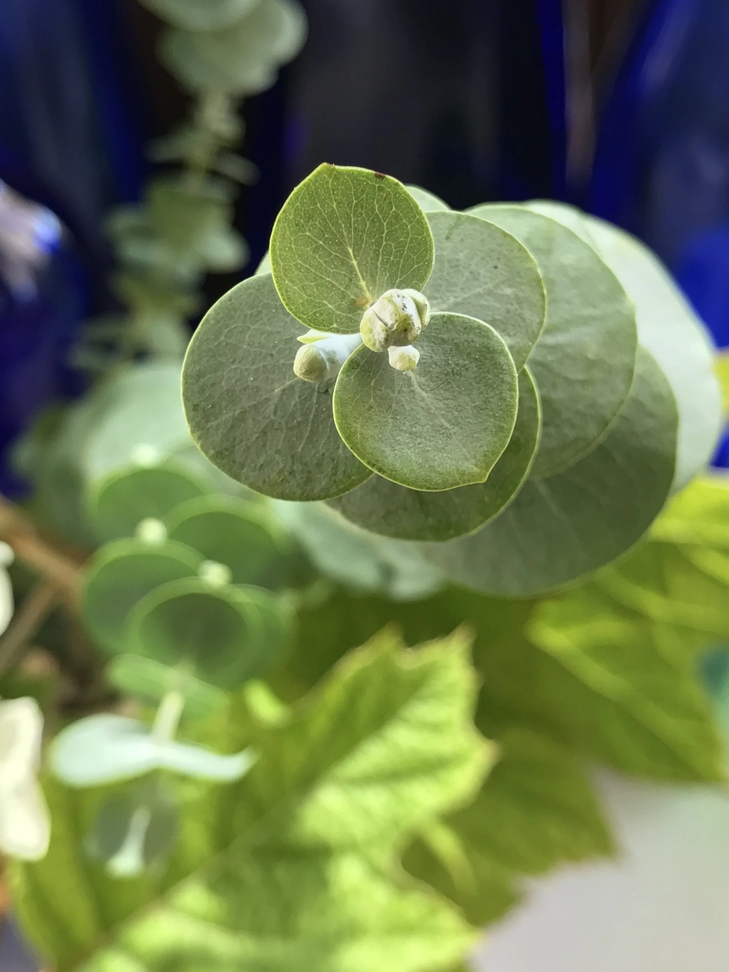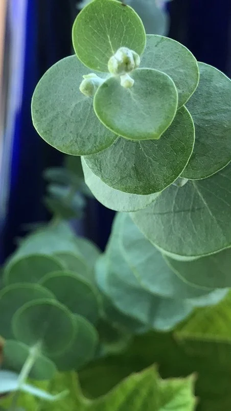 Eucalyptus sp. 'Baby Blue' --popular in the florist trade for its coins of powdery blue juvenile foliage. I grow it outside in a pot.