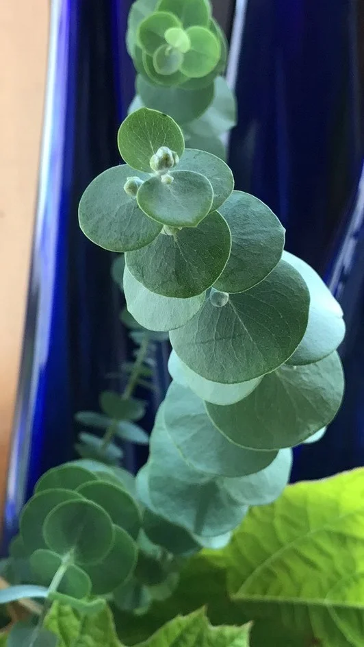 ...and added a few clippings of Eucalyptus 'Baby Blue,' which I grow outside in a container that it has far outgrown.